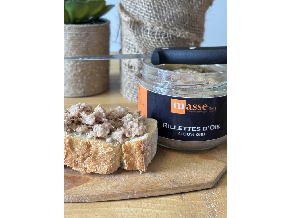 Goose rillettes are made from seasoned goose meat and fat, slowly cooked at low temperature then drained to avoid excess fat. The recipe preserves the traditional flavors of southwest France, resulting in a rich, authentic, savory product.