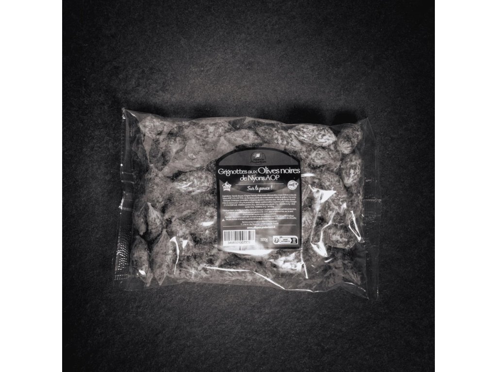 vepřové maso (původ francie), vypeckované černé olivy z černých oliv nyons aop 7,2 %, laktóza, sůl, dextróza, pepř, česnek, konzervanty: dusičnan draselný. mléčné fermenty. jedlý obal (kolagen, glycerin, celulóza).