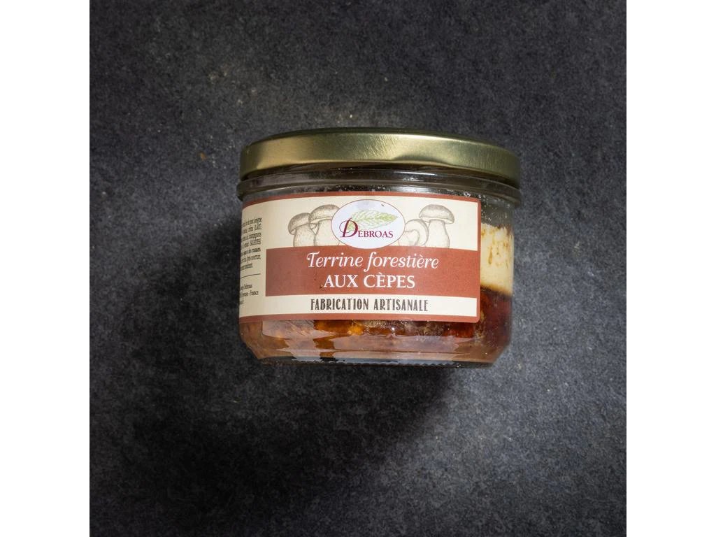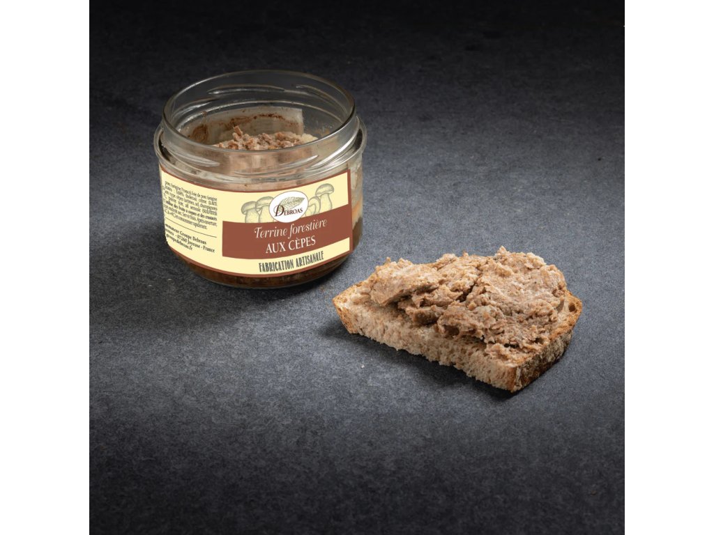 Lesní terina s hřiby je tradiční francouzská specialita připravená z vepřového masa a tuku a vepřových jater, doplněná o sušené hříbky, které dodávají terině výrazné lesní aroma. Jemná receptura je obohacena o smetanu, vejce, koňak, koření a přírodní houbové aroma, což vytváří plnou a harmonickou chuť.