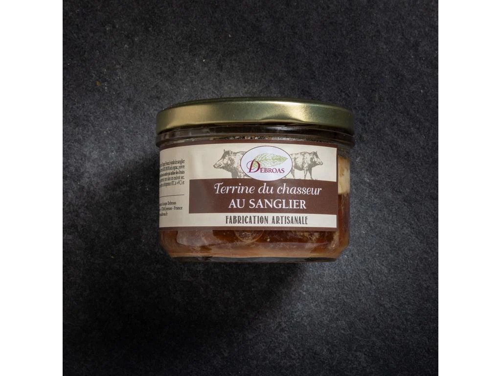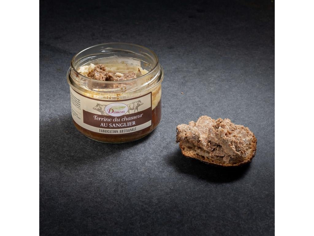 Lovecká terina s masem z divokého prasete je tradiční francouzská specialita připravená z vepřového laloku, vepřových jater a výrazného podílu masa z divokého kance. Receptura je doplněna smetanou, vejci, koňakem, černým pepřem a česnekem, což vytváří plnou, výraznou chuť typickou pro zvěřinové teriny.