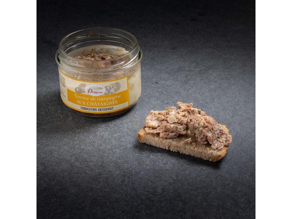 Venkovská terina s kaštany je tradiční francouzská specialita připravená z vepřového masa a tuku, vepřových jater a kousků kaštanů. Receptura je doplněna smetanou, vejci, koňakem, černým pepřem a česnekem, což vytváří jemnou strukturu a bohatou, vyváženou chuť.